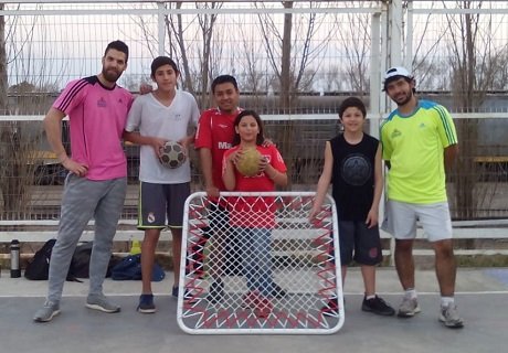 "Se llama Tchoukball, y es una mezcla de habilidades de handball voley y básquet. Se juega en dimensiones de cancha de básquet 7 vs 7, pudiendo jugarse por sexo o mixto. A diferencia de otros deportes esto no cuenta con arcos o tableros de básquet, sino con tableros de tchoukball como en la foto.