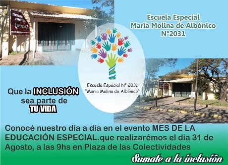 La Escuela Especial N° 2031 "María Molina de Albónico" invita a su próximo evento a realizarse el día Miércoles 31 de agosto a partir de las 9 hs. en Plaza de las Colectividades con motivo de festejar el MES DE LA EDUCACIÓN ESPECIAL.