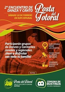 Es el sabado 18 de febrero en el SUM Comunal de Bustinza, con grupos de canto y danzas zonales y locales. Proximamente la programación ...! Te esperan a partir de las 20 con reposeras y esmerado servicio de buffet.