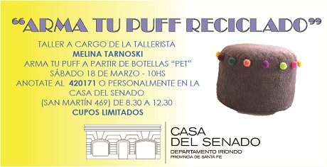 La Casa del Senado y el Senador Hugo Rasetto, invitan al taller "Arma tu Puff reciclado" a cargo de la tallerista Melina Tarnoski.