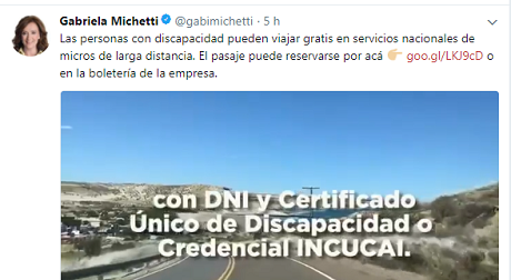 Un comunicado por Twitter emanado por la vice-presidente de la nación, Gabriela Michetti, anuncia que discapacitados pueden reservar los pasajes gratis nacionales on-line. Para ello hace click aquí.
