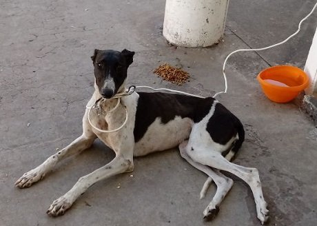Al llegarse el lugar, 40 metros hacia el este, se encontró con dos galgos atados sin agua y sin comida bajo un árbol, el cual uno yacia muerto.