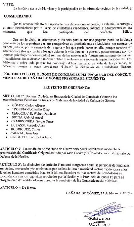 de Malvinas que se ganaron el maximo reconocimiento de la ciudad por su participación en la gesta de la Islas Malvinas en 1982." expresó Matias Chale, edil que encabeza el bloque del Frente Progresista Civico y Social. A continuación la resolución.