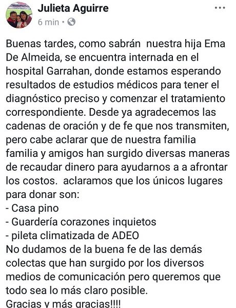 Nos referimos al pedido solidario que circula por el caso de una nena de nuestra ciudad que esta internada en el Garraham.