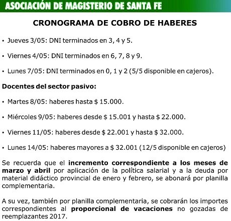 El Ministerio de Economía de Santa Fe dio a conocer el cronograma de pago de sueldos para los agentes provinciales. El MIERCOLES 2 DE MAYO de 2018, comenzarán a abonarse los sueldos.