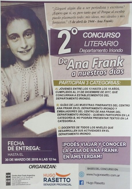 Queremos contarles que desde el año 2013, Hugo Jesús Rasetto junto a la Casa del Senado del Departamento Iriondo, realiza diferentes proyectos en conjunto con la Casa de Ana Frank Argentina, situada en Buenos Aires. La Casa de Ana Frank es una organización independiente encargada de preservar la Casa de Atrás, el
