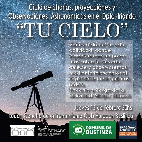 El próximo 15 de febrero a las 20 hs. “Tu Cielo”, el ciclo gratuito de charlas y observaciones con telescopios organizado por la Casa del Senado y el senador Rasetto, que recorrerá las localidades