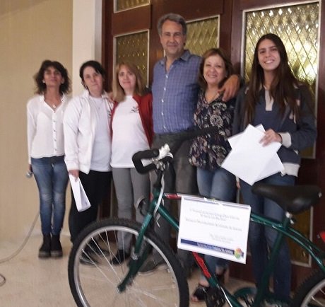 La secretaria de Cultura Raquel Di Paola y el vice presidente del Concejo Municipal Marcelo Casalegno entregaron una bicicleta como primer premio del certamen organizado por el Colegio Superior Florentino Ameghino.