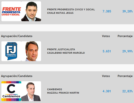 Al momento con 76 de 77 mesas escrutadas, Chale 39,20%, Casalegno 29,99% y Mazzoli 22,83%, Bertoya 3,49%, Diez 2,71% por lo que al momento estos sería los tres concejales que ingresan al recinto el 10 de diciembre.