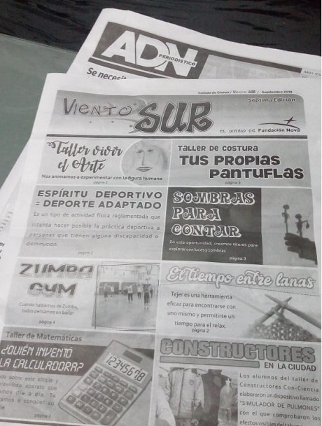 Conjuntamente con el semanario ADN de nuestra ciudad, se distribuye Viento Sur, el suplemento informativo de los diferentes talleres re-creativos que se llevan a cabo en Fundación Nova.