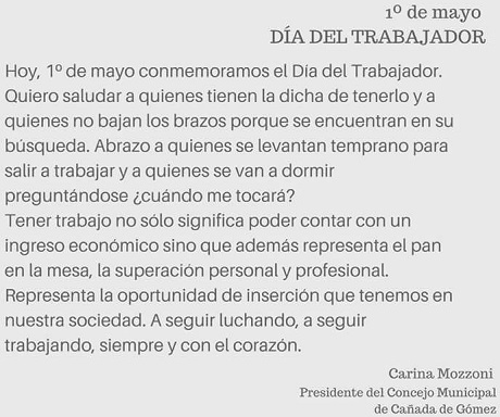 El equipo de gobierno de la municipalidad de Cañada de Gómez saluda a todos los trabajadores en su día.