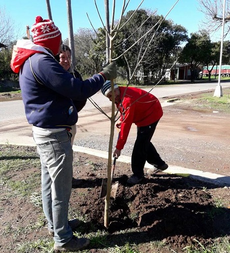Tras los trabajos constantes en su bella plaza, la comuna refuerza la llegada de la primavera con forestación en su radio urbano, colocando plantas en las calles